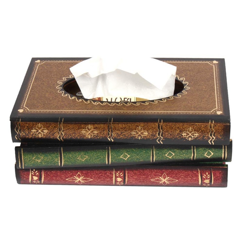 • Material: Wooden; The other side of the tissue holder has the gold edges of the books.