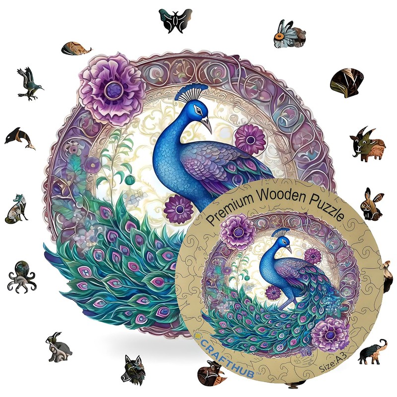 Crafthub Animal Shaped Wooden Puzzles for Adults – A3 Peacock Surrounded by Flowers with 129 Pieces – Jigsaw Puzzle with Unique Shapes – Family Games for Kids and Adults – 10" x 9.9" (25.6cm x 25.2cm)