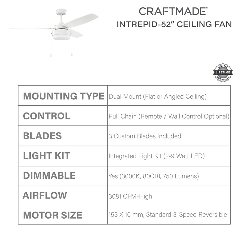 Craftmade INT52W3 Intrepid 52" Ceiling Fan with LED Light, 3 Blades, White