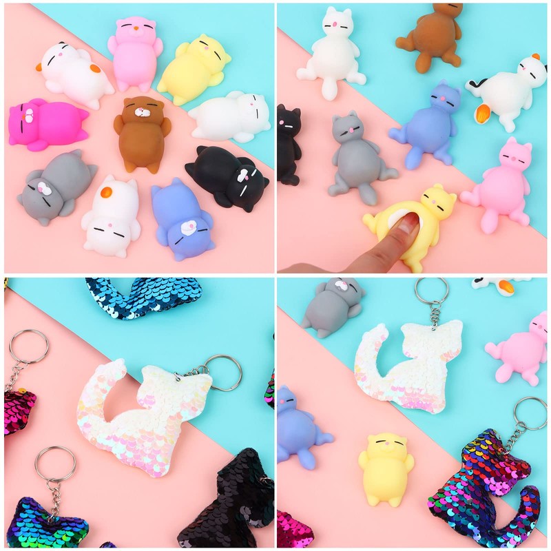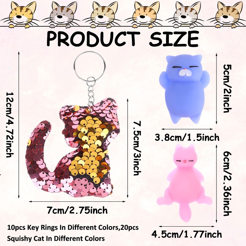 - Cute Mochi Cat Set--You will receive 10 pcs squishy mochi cats + 10 pcs sequin cat keychains+10 pcs big belly mochi cat,a total of 30 pieces.Miniature animal toys are designed with bright colors and vivid appearance to cultivate color cognition and relieve stress.
