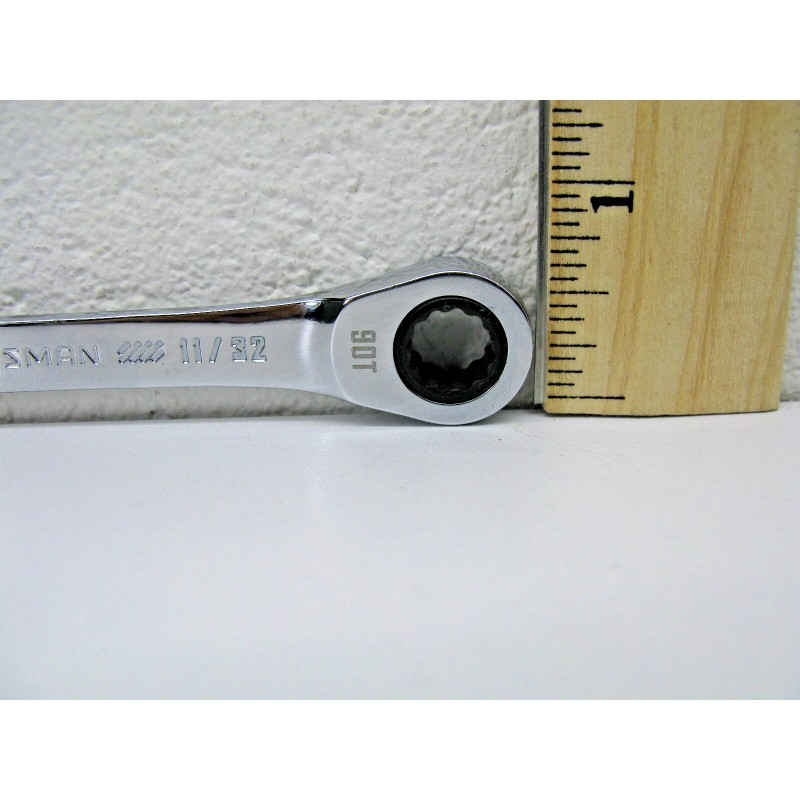 Hello and thank you for looking. Up for purchase is a CRAFTSMAN CMMT87233, 11/32" SAE 90 Tooth Combination Ratcheting Wrench, 12 Point.
