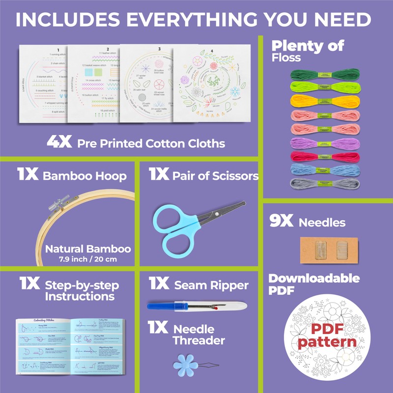 - 🧵 Craftwiz Embroidery Kit for Beginners - Ultimate Embroidery Set for Beginners - Thoughtfully crafted for embroidery novices, this kit includes everything to begin your embroidery journey: Bamboo Hoop ((7.8 in), 4 Pre-Printed Cotton Cloths (12x12in), Plenty of Embroidery thread (23.3 ft each) Needles, Scissors, Seam Ripper, Needle Threader, and "The Complete Beginner's Guide to Embroidery" book to help you get started.