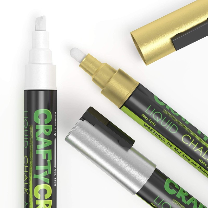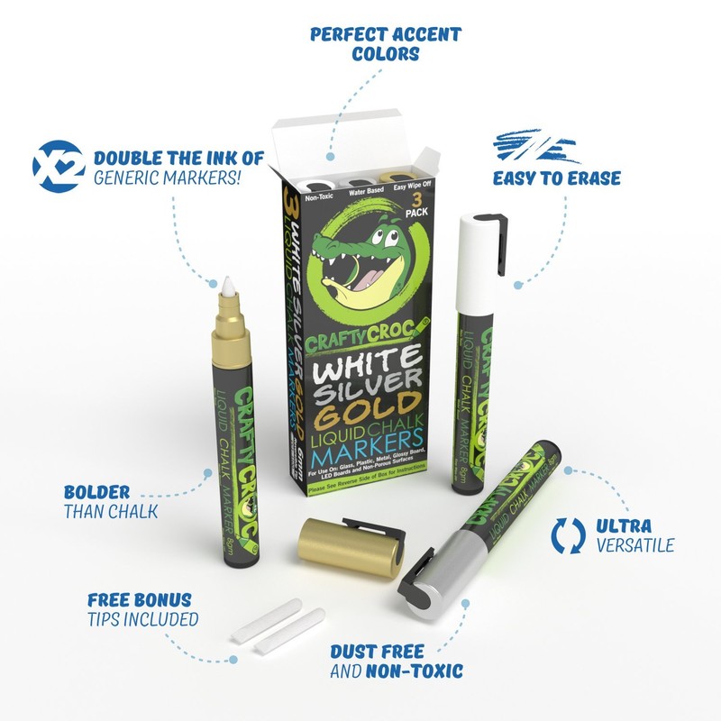 Crafty Croc Metallic Chalk Markers, Gold Silver White - 3 Pack, Medium Tip 6mm, Wet Erase for Accent Details
