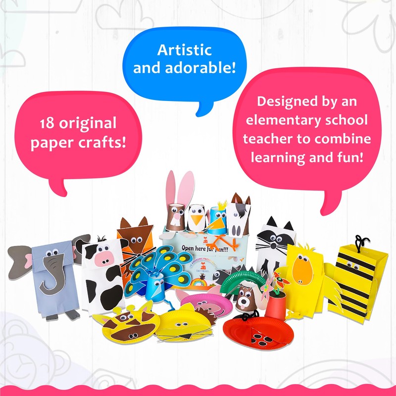 - Whimsical Animal Themed Kit: These 18 Awesome Paper Crafts kids art kits feature beautiful, original animal-themed crafts that will instantly captivate the minds of the little ones through vivid colors and fun, whimsical designs. From dinosaurs, fierce lions, sweet giraffes, to pigs, ladybugs and penguins, all there to teach a wonderful lesson about the magical world of animals!