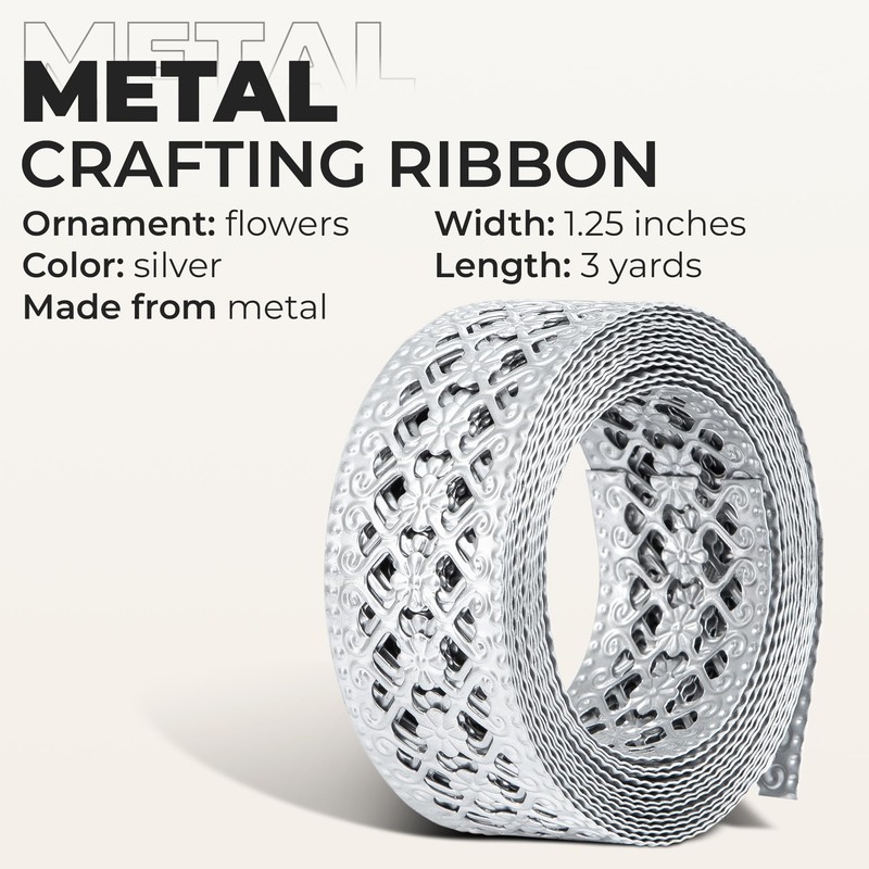 CraftyCrocodile Metal Ribbon for Decor Craft - Decorative Silver Trim for Crafting - 1 1/4" x 3 Yards Long