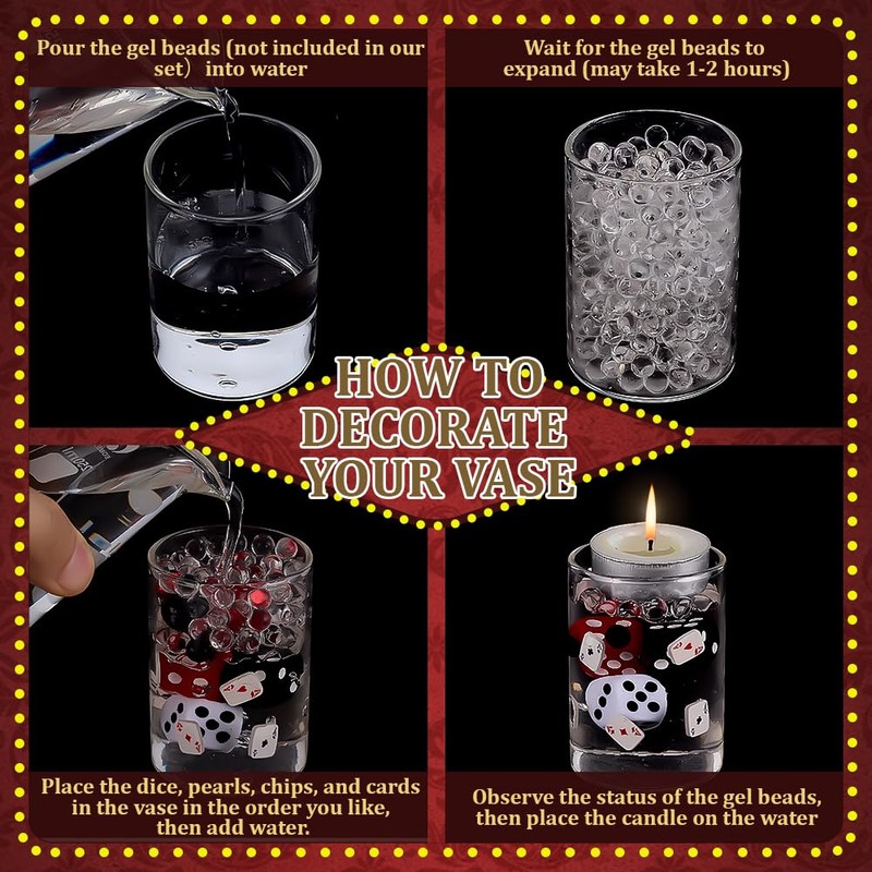 - Casino Element Decorations: These casino vase fillers include elaborate beads, dice, playing cards and more in vibrant colours and realistic details, and the classic black and red colour scheme is perfect for a party atmosphere and other gathering occasions as a beautiful decoration