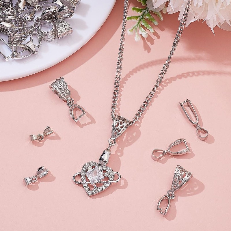 CRAFTYMELODY 48Pcs Pinch Bail Clip Clasp 6 Style Brass Snap on Bail Platinum Bead Pendant Connector Dangle Charm Jewelry Finding for Jewelry Making Accessory Supplies Necklace Bracelets DIY Craft