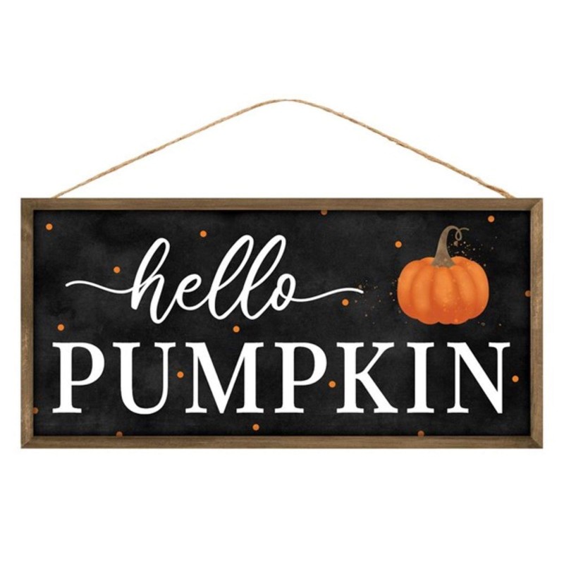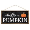 - This black MDF wood sign (Printed Paper on MDF) reads "hello PUMPKIN" with a tan framed edge and a cute pumpkin accent. This sign is perfect for Halloween or Fall.