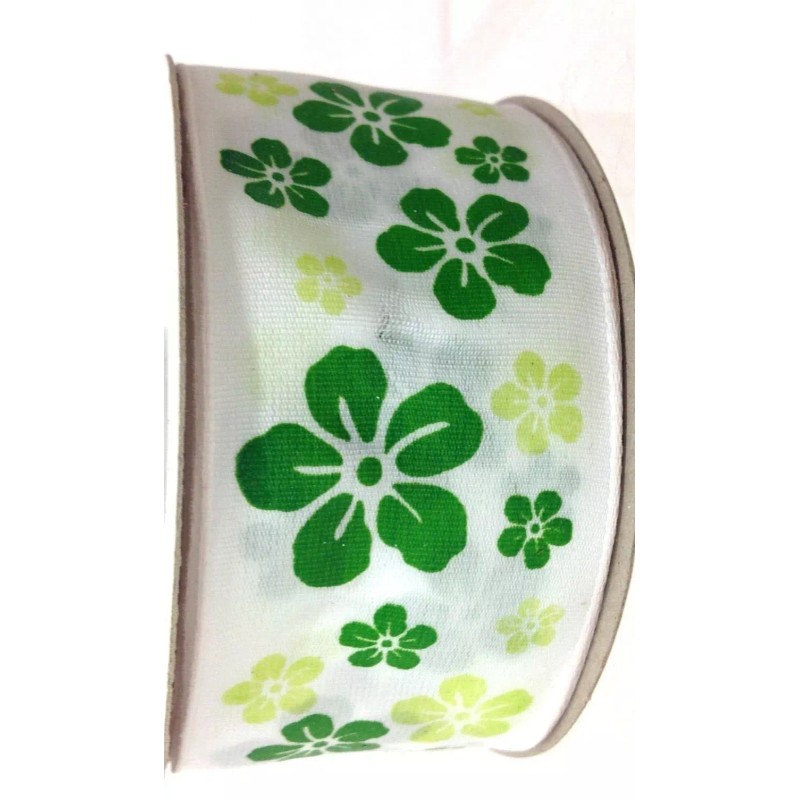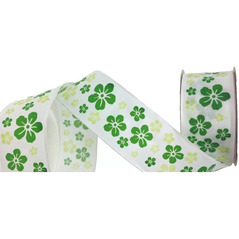 Craig Bachman Green Flowers 1.5" by 2 yards White Wired Ribbon Spring St. Patrick's Day