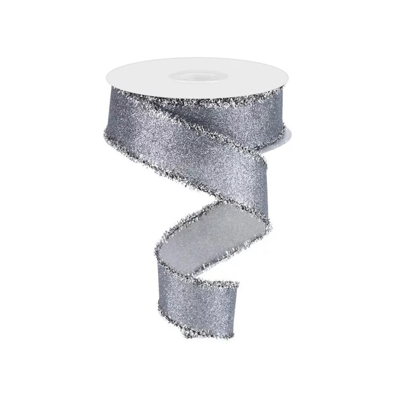 Use this marvelous shimmer glitter/tinsel on pongee fabric ribbon to add some serious shine to your next creative project. This ribbon has a tinsel wired edge, with a solid pewter silver base covered in glitter, making this ribbon a versatile addition to any display you see fit.