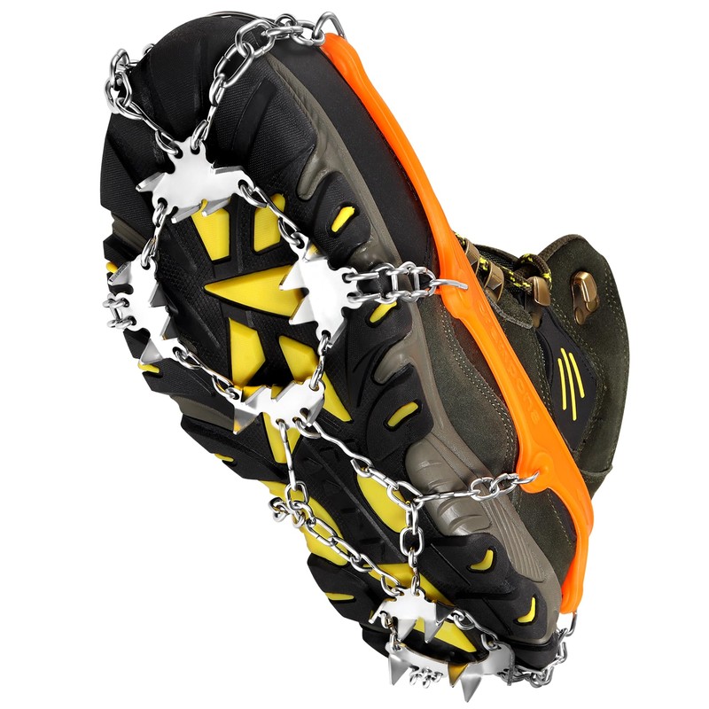 - High-quality stainless steel spikes: 24 abrasion-resistant, multi-directional, reinforced stainless steel spikes. 16 spikes on the forefoot and 8 spikes on the heel. Stronger welding chain with more robust spikes. High-strength stainless steel spikes provide excellent traction in different terrain and helps you keep yourself safe and injury-free.