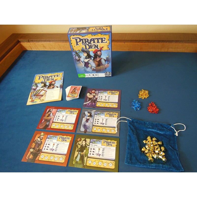 Pirate Den is a game of bluffing and deception for 3-5 players that plays in 30 minutes or less. Players take on the role of pirate captains trying to get the most loot. Plunder the seas, steal from your rivals, and bury your treasure to protect it. The captain with the most loot at the end of the game, wins. In the game players will play cards to take gems from the center of the table and from each other, and bury to turn 5 gems into buried treasure to prevent it from being stolen. When one player has 5 buried treasure the game ends and the person with the most points between their gems and buried treasure wins, with each gem being worth 1 and each buried treasure being worth 5.
