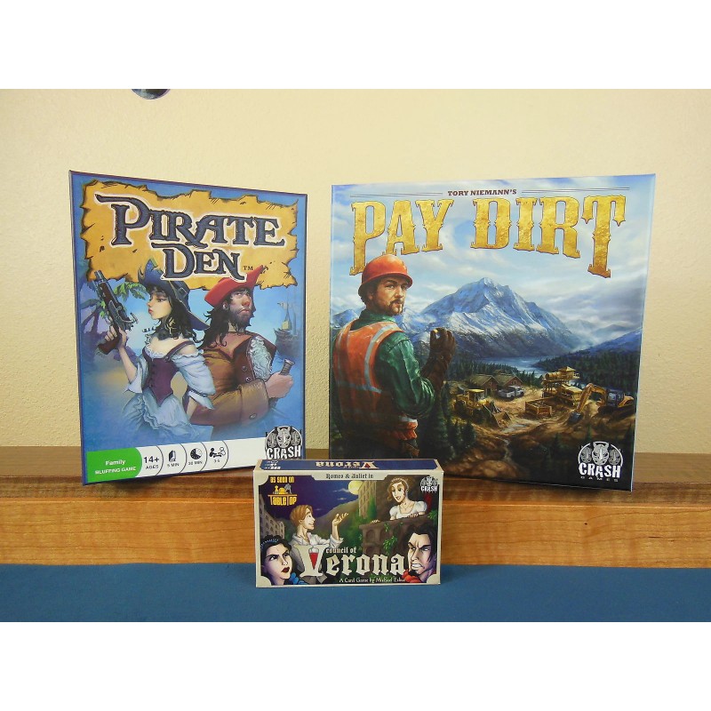 All New- Crash Games--- Pay Dirt, Pirate Den and Council of Verona GAME PACK. Perfect for a Holiday Board Game Pack!