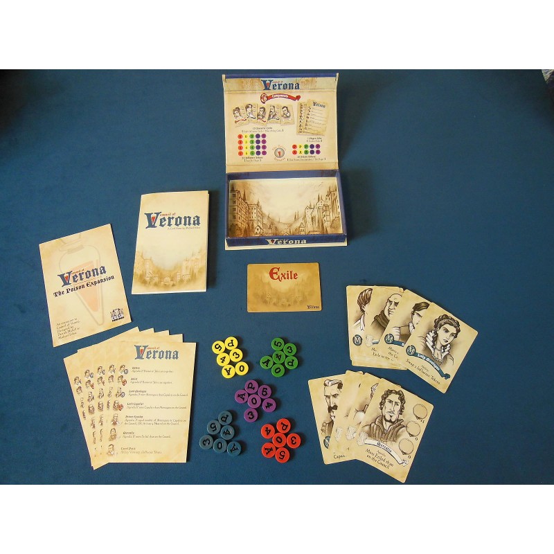 In Council of Verona 2nd edition w/ Poison expansion pack), players take on the role of influential citizens of Verona and act to use their influence to either add characters to the council or cast them into exile. Through thoughtful hand management of their cards and clever placement of influence tokens, players gain victory points based upon the agendas of the characters at the end of the game. The player with the most victory points wins! We've all heard the story of Romeo and Juliet - now is your chance to steer the story and determine who will rule Verona once and for all!