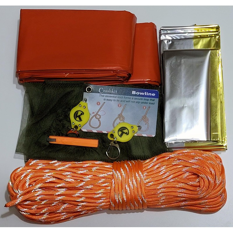 Included in the Crashkit Survival Start One are a brand name Sparklite SL-3-HO fire striker, 100 feet of Crashkit brand Firecord, a Crashkit Knotcard, a water resistant Crashkit LED keychain light, a Crashkit Mosquito Headnet along with a Crashkit Emergency Bag and Blanket.