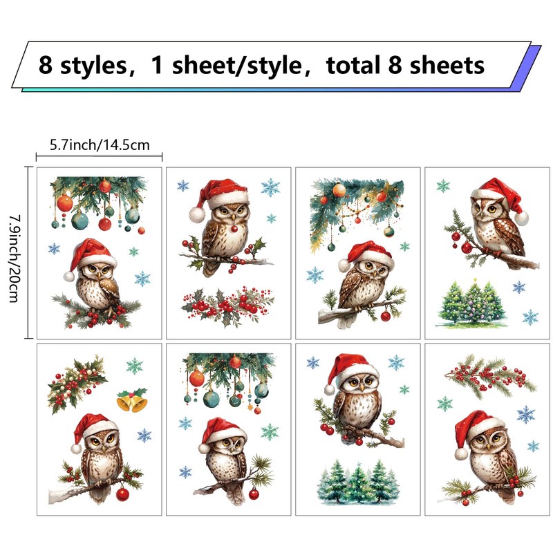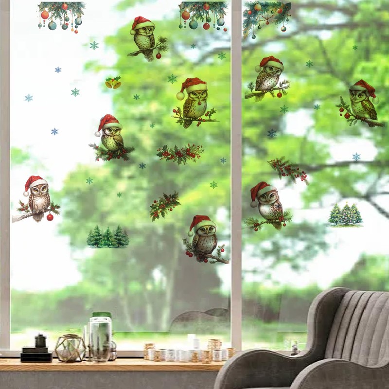 - Owl Window Sticker: The owl standing on the tree, wearing a Christmas hat and snowflakes fluttering around it, has a Christmas tree hanging red and green Christmas decorative balls on its head, creating a strong Christmas atmosphere