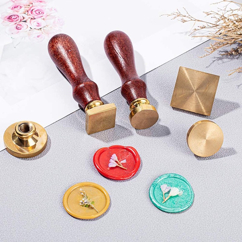 - BLANK WAX SEAL STAMP HEAD SET: 6PCS different shapes & sizes blank wax seal stamp head, including: 3pcs x different size round wax seal stamp head + 3pcs x different size square wax seal stamp head +2pcs wood handle.