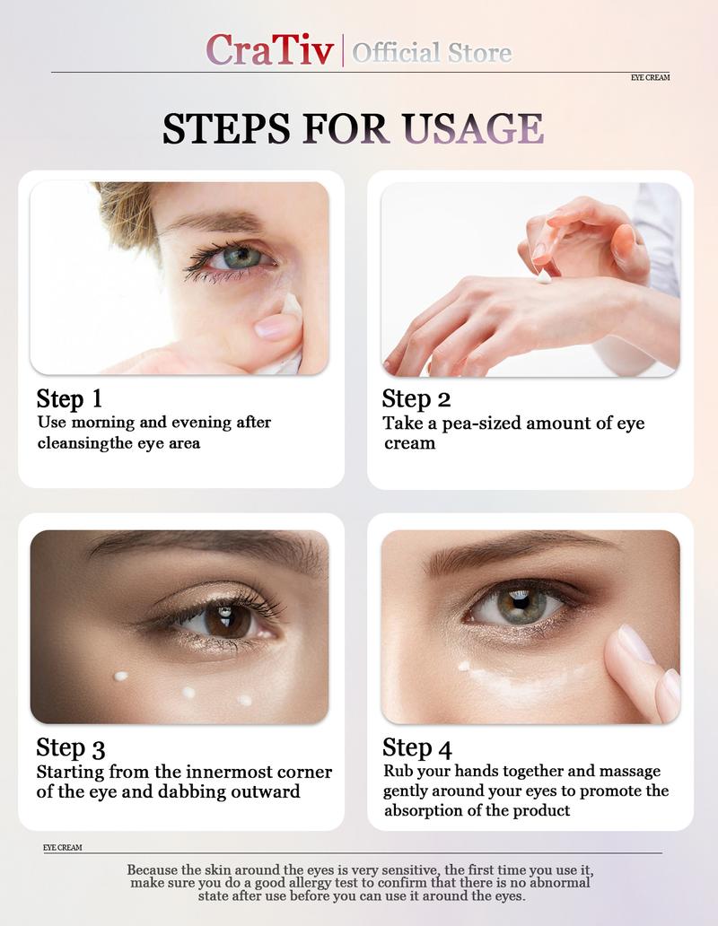 Every night before bedtime, after cleansing your face, take an appropriate amount of Crativ Anti-Wrinkle Eye Cream (Night) and gently apply it to the skin around your eyes. Massage gently until fully absorbed. For optimal results, use in conjunction with other skincare products.