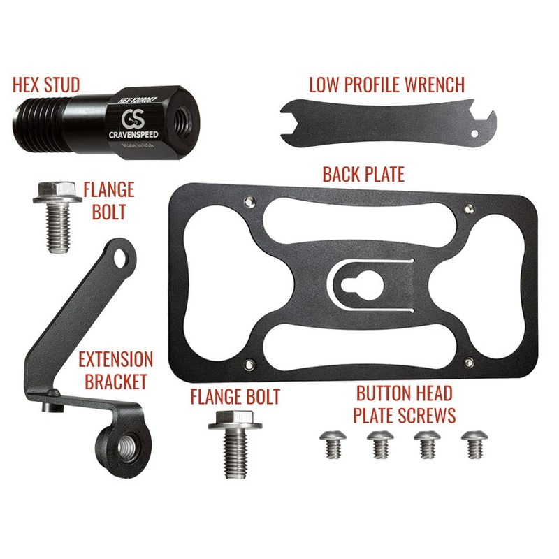 NOTE: The included hardware is just the right length for a plate, and not long enough to also mount a plate frame. Contact CravenSpeed for longer bolts or specs for your friendly local hardware supplier.