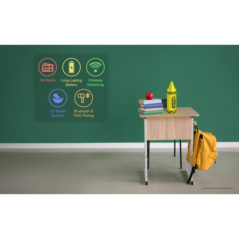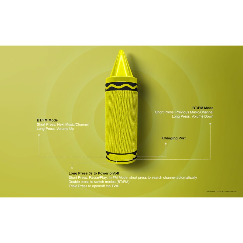 - CRAYOLA CRAYON BLUETOOTH SPEAKER: Bring Color to Your Sound! Add a splash of color to your music experience with this Crayola Bluetooth Speaker! Inspired by the iconic Crayola Crayon, this vibrant speaker combines playful design with impressive sound quality making it the perfect choice for both kids & adults who want to add a little fun to their tunes. Whether you're jamming out at home or taking it on the go, this speaker delivers clear, crisp sound wrapped in a colorful, Crayon-shaped package.