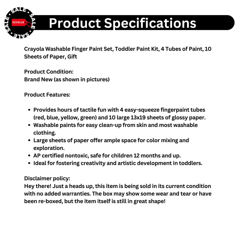 - Provides hours of tactile fun with 4 easy-squeeze fingerpaint tubes (red, blue, yellow, green) and 10 large 13x19 sheets of glossy paper.