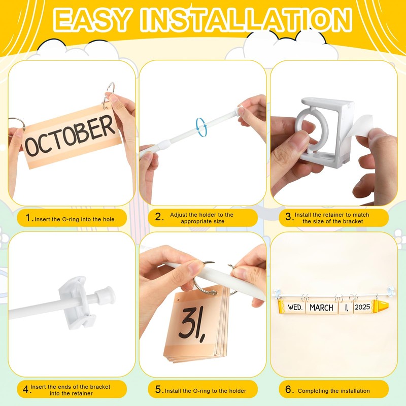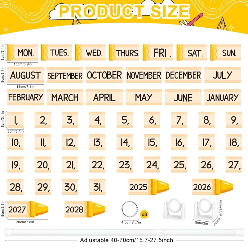 - Adjustable Holder: The classroom flip calendar features a metal hanging rod adjustable from 15.7" to 27.6" and 8 durable O-rings. Simply attach cards to rings and mount the bracket anywhere!