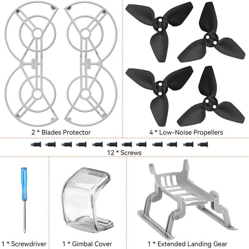 - Neo drone accessories: this 4-in-1 bundle set is compatible with DJI Neo drone, contains 4 paddles with 12 screws and 1 screwdriver, 2 propeller protection, 1 piece landing gear, 1 piece gimbal cover