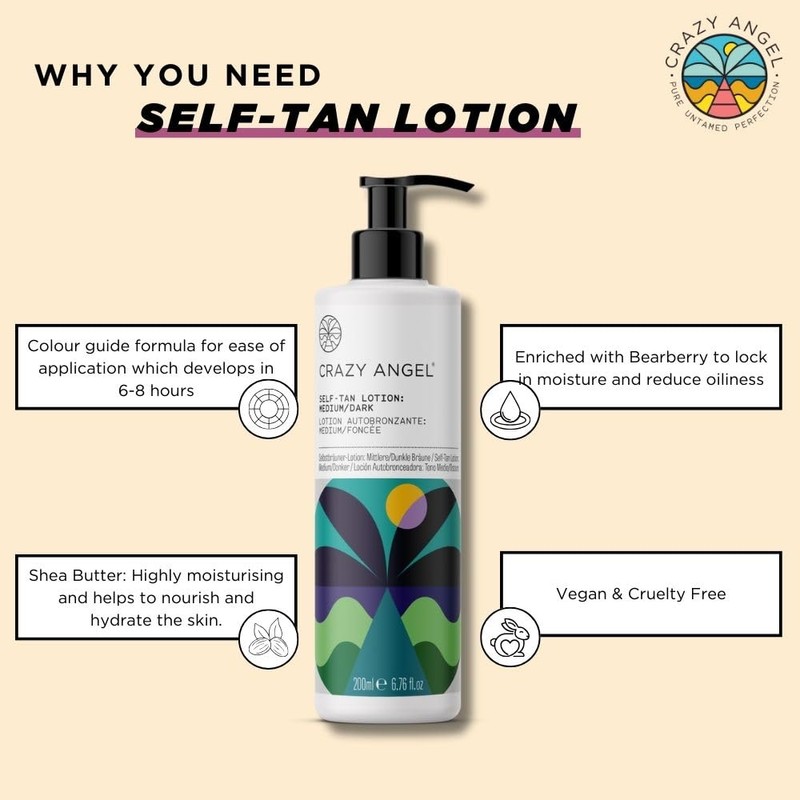 Crazy Angel Vegan Self-Tan Lotion (Medium/Dark Tan). Made in UK. 200ml.