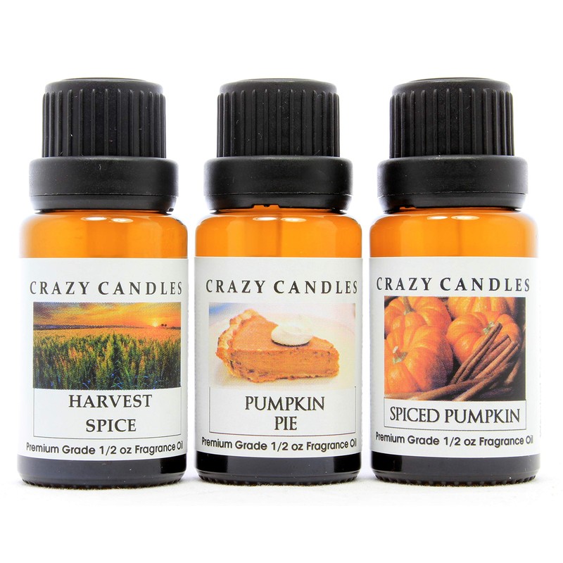 Crazy Candles 3 Bottles Set (Made in USA) 1 Spiced Pumpkin, 1 Harvest Spice, 1 Pumpkin Pie 1/2 Fl Oz Each (15ml) Premium Grade Scented Fragrance Oils