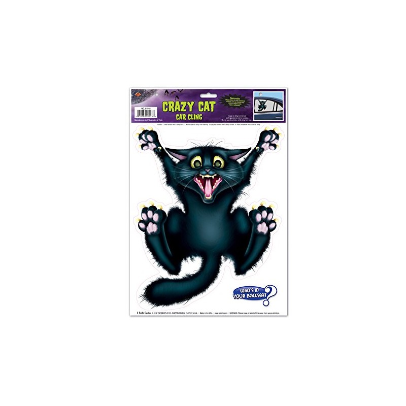 Beistle 01048 Crazy Cat Car Cling. This sheet includes one cling of a black cat with its legs sprawled out like it's clinging on for dear life! Great to put in a backseat car window.
