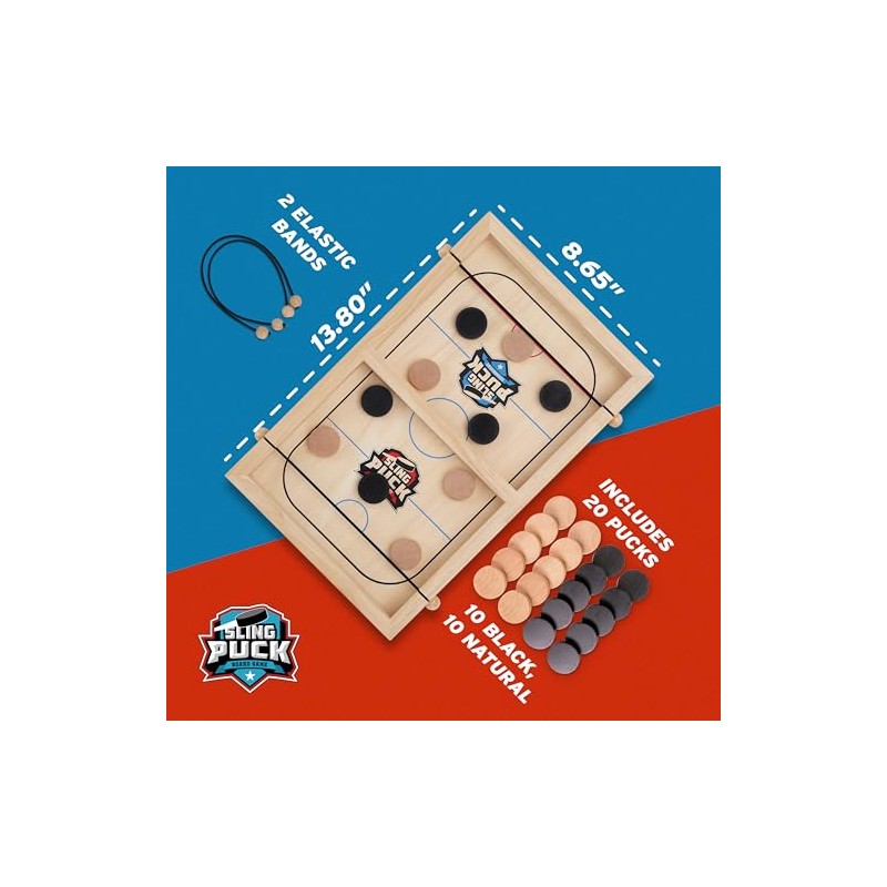 - FAST PACED WOODEN BOARD GAME FUN: Experience the thrill of rapid-fire action as you sling pucks across the board to outscore your opponent! So Puck It and play indoor or outdoor on any table top.