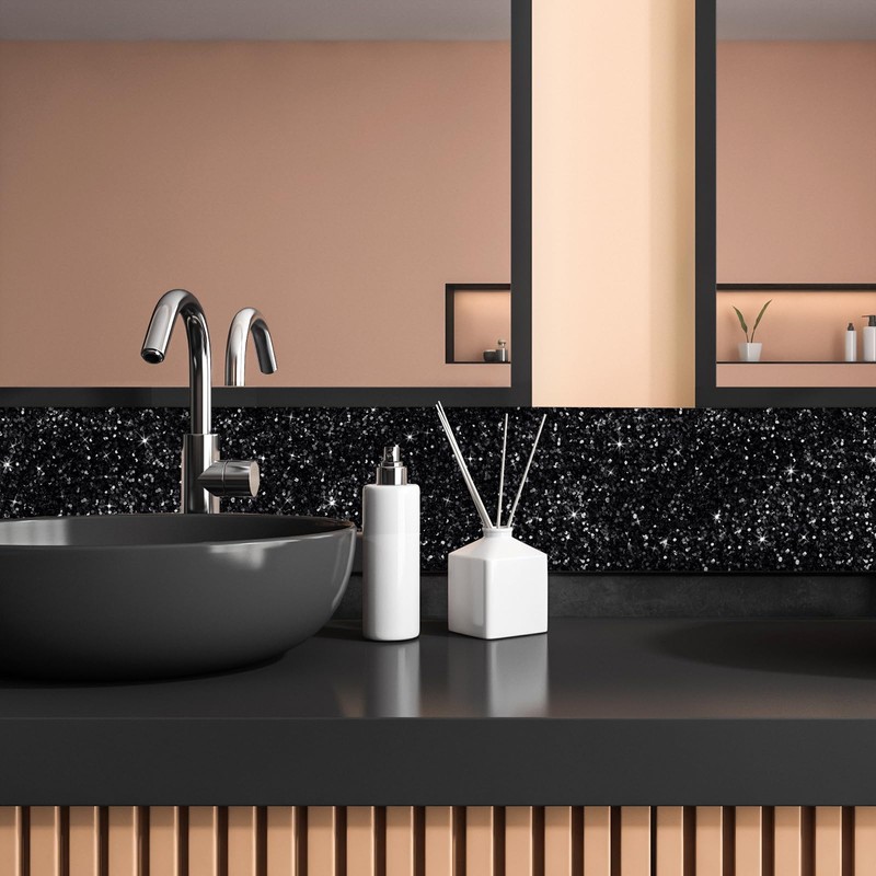- ◀ Chunky Glitter Wallpaper ▶ Multi-purpose: Black textured wallpaper glitter wallpaper stick and peel for bedroom, bathroom, living room, girls room, powder room, classroom, office, dorm, bars, cabinets, counters, dressers, drawers, shelf liners, vanity, windows, stair riser, ceiling, baseboard trim, mirror frame, bulletin board, DIY crafts, books, table lamp, gift wrapping paper, party decoration