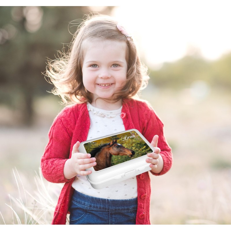 The lovingly designed motif is printed directly on an aluminium plate, which is glued to the tin with a special adhesive. Thanks to the personal print, this lunch box is absolutely unique and a confusion is almost impossible.