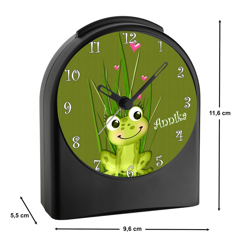 CreaDesign, WU-50-1060, Frosch, analog Kinderwecker schwarz, Funkwecker ohne Ticken, mit Licht, personalisiert mit Namen, 9,6 x 5,5 x 11,9 cm, 104 g