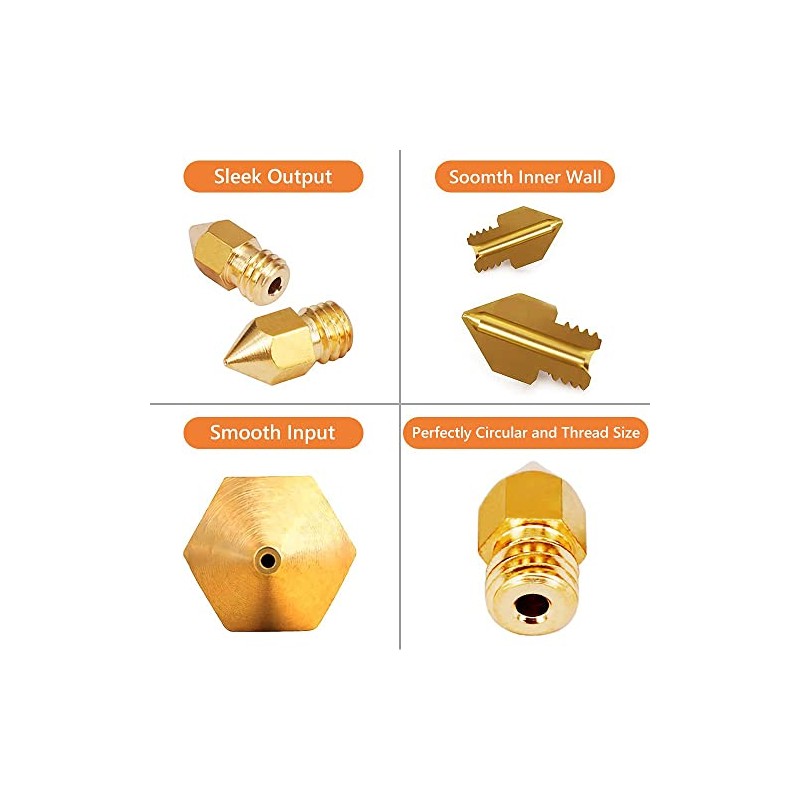 - ??Perfect and DurableThe brass nozzle has better thermal conductivity. It is recommended to print at standard temperature. Filaments like PLA, TPU are ideal choices. It not only reduces the resistance, avoids the clogging of the filament on the rounded chamfer, but also has a long service life and makes the filament smoother.