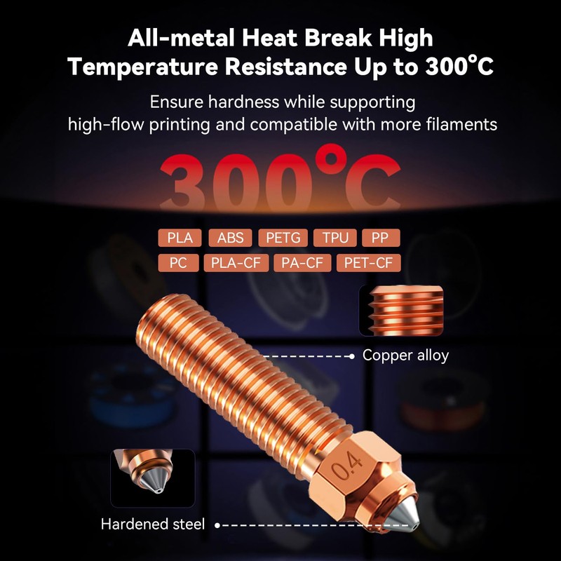- 【300°C High Temperature Resistance】Creality hotend nozzles 0.4mm are all-metal design consisting of a copper alloy and hardened steel that can withstand temperatures up to 300°C. The copper alloy nozzle has superb thermal conductivity, while the hardened steel nozzle is harder and more abrasion-resistant. Upgrade nozzles support high flow printing while ensuring hardness