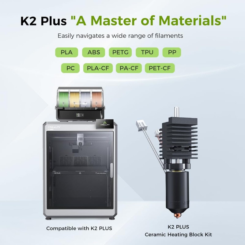 - Maestro de materiales: el bloque de calefacción Creality K2 Plus puede alcanzar temperaturas de hasta 350 °C. Diseñado para su uso con materiales de ingeniería resistentes al desgaste de altos puntos de fusión, PLA, ABS, PETG, TPU, PP, PC, PLA-CF, PA-CF, PET-CF, etc.