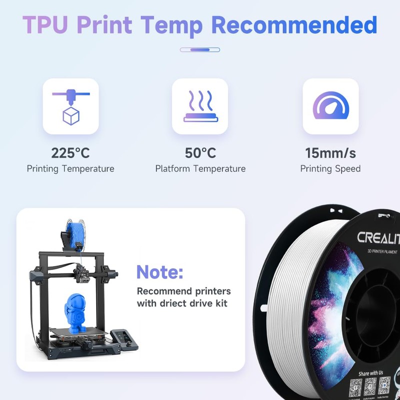 - Soft Filaments of High Elasticity:Creality TPU Flexible Filament is a thermoplastic polyurethane (TPU) based filament specifically engineered to work on most desktop 3D printers. It has a shore hardness of 95A and can stretch 3 times more than its original length. Excellent bed adhesion, low warp and low odor, make these flexible 3D filaments easy to print.