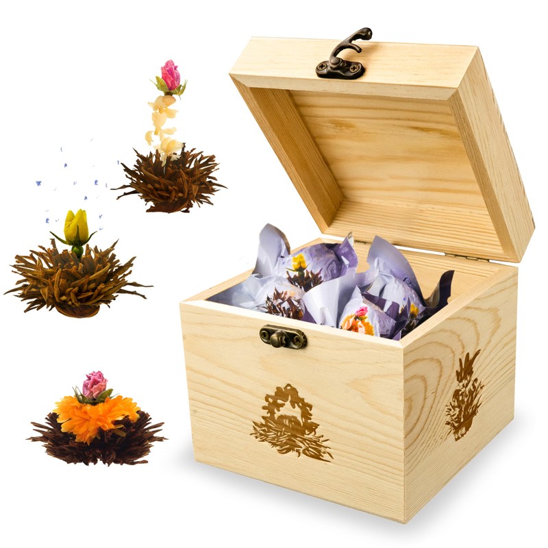 - Offer: tea flowers gift set with 6 tea roses in 3 varieties - black tea. Our offer for real tea lovers comes in an attractive wooden decorative box as gift packaging.