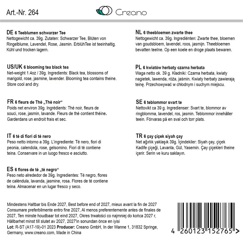 - Quality: Creano ErblühTees are a branded product of all the best quality. We attach great importance to the quality of the tea, flowers as well as the function and appearance. As a member of the German Tea Association, we stand for the greatest possible product safety and are subject to the "Code of Conduct"