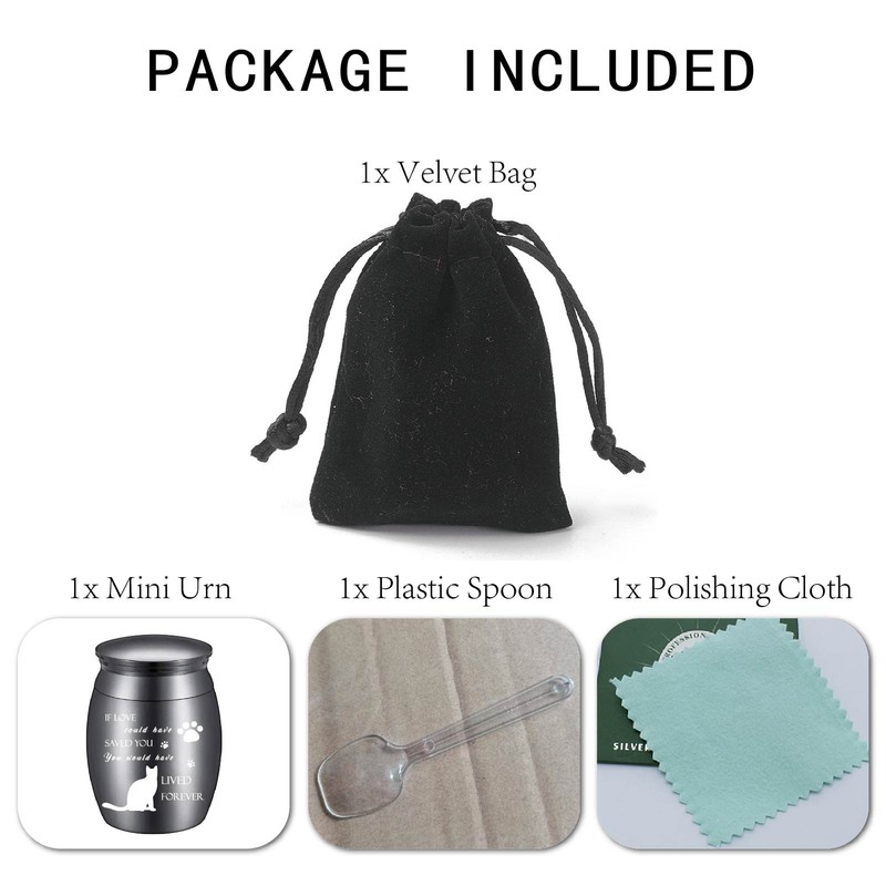 • MINI URN SIZE: Urn size: 1.18x1.57inch(30x40mm), deep: 1.18inch(30mm). Included: 1pc x velvet bag, 1pc x plastic spoon, 1pc x polishing cloth, 1pc x mini urn. Mini Urn is suitable to carry a small amount of ashes (appro 11.3 milliliter).