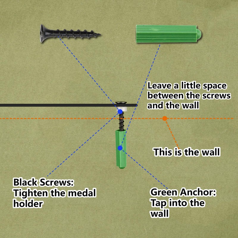 - [EASY TO INSTALLATION]: ① Mark the screw location with a pencil. ② Use a power drill (5mm drill bit) to make holes for the wall anchors. ③ Tap the green anchor gently into the wall with a hammer. ④ Tighten the screw inserted into medal holder and green anchors.