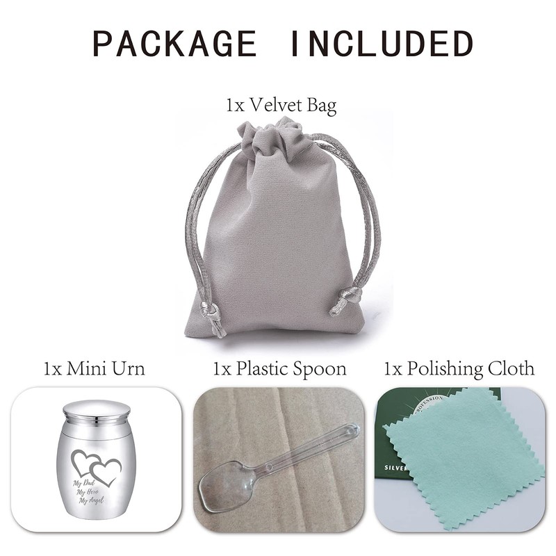 - MINI URN SIZE: Package includes: 1 x velvet bag, 1 x plastic spoon, 1 x polishing cloth, 1 x mini urn, urn size: 1.57 x 1.18 mm, deep: 1.18 inches (30 mm). Mini urn is suitable for carrying a small amount of ashes (approx. 11.3 millilitres).