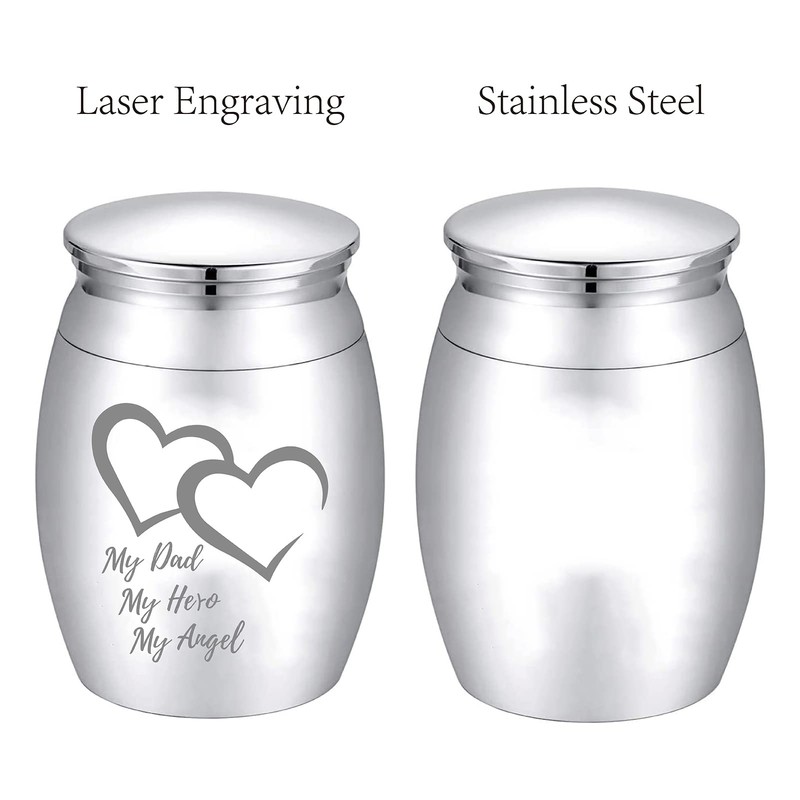 - STAINLESS STEEL MATERIAL These small urns are both made of high quality stainless steel, it is waterproof, never deform, corrode and fade. It can hold small portions of perfume, hair/fur, ash or something else that will preserve memories between you and your loved ones. You can ensure the safety of your partner.