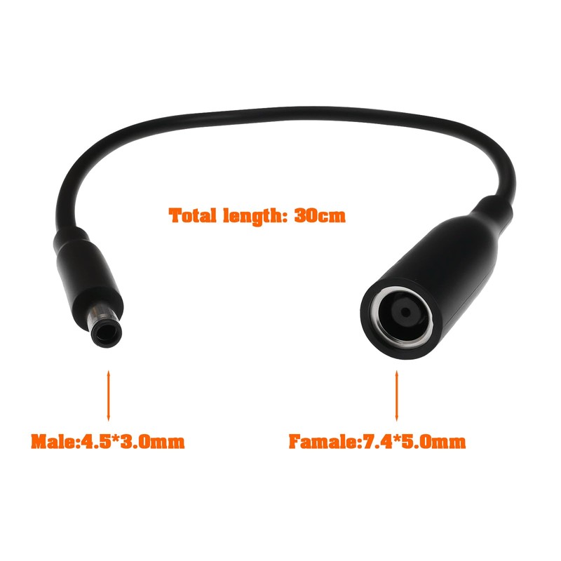 - Dimensions: Input (Female): 7.4mm outer, 5.0mm inner, pin included; Output (Male): 4.5mm outer, 3.0mm inner, pin included. Length: 30cm, making it compact and easy to use.