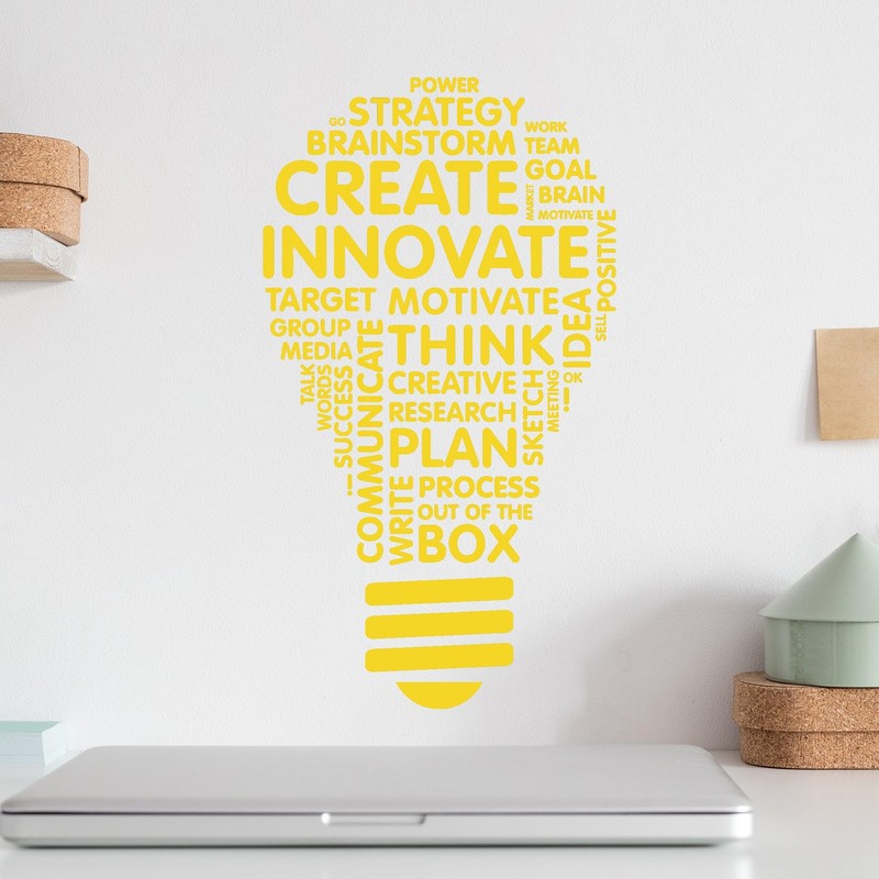 - Inspiring Design: Our light bulb-themed word cloud vinyl wall decal is brimming with words that ignite creativity and motivate innovation, enhancing your space visually and mentally