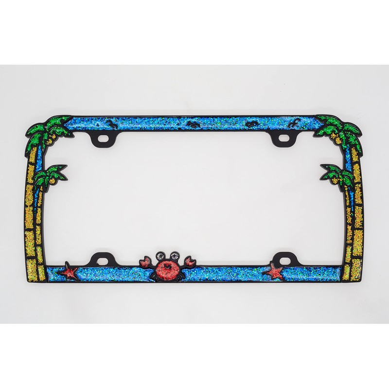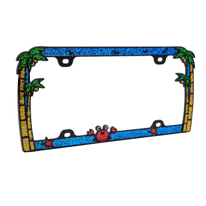 - Palm tree crab license plate frame, Palm tree, sea, blue sky, crab, lively, calming, beautiful, made of zinc alloy, shimmering powder epoxy, commonly used -standard license plate with 2 holes and 4 holes.Fits all standard 6x12 inch US & Canadian novelty/license plate frames. Fits all standard 6x12 inch US & Canadian novelty/license plate frames.