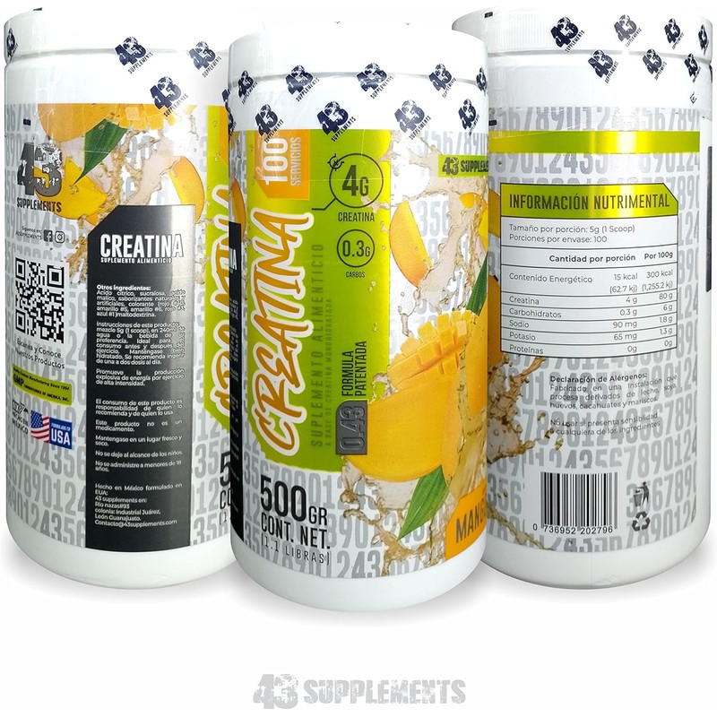 Creatina Monohidratada 43 SUPPLEMENTS 500 Gramos para 100 Porciones Sabor Mango
