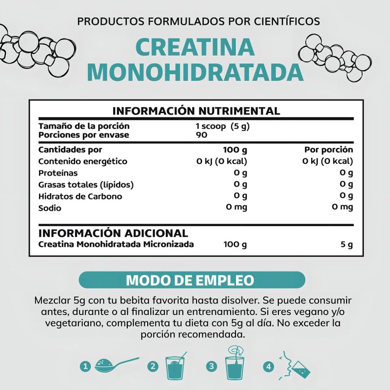 Es apto para veganos y/o vegetarianos. 5g de Creatina = 1 Kg de carne de res (aprox).