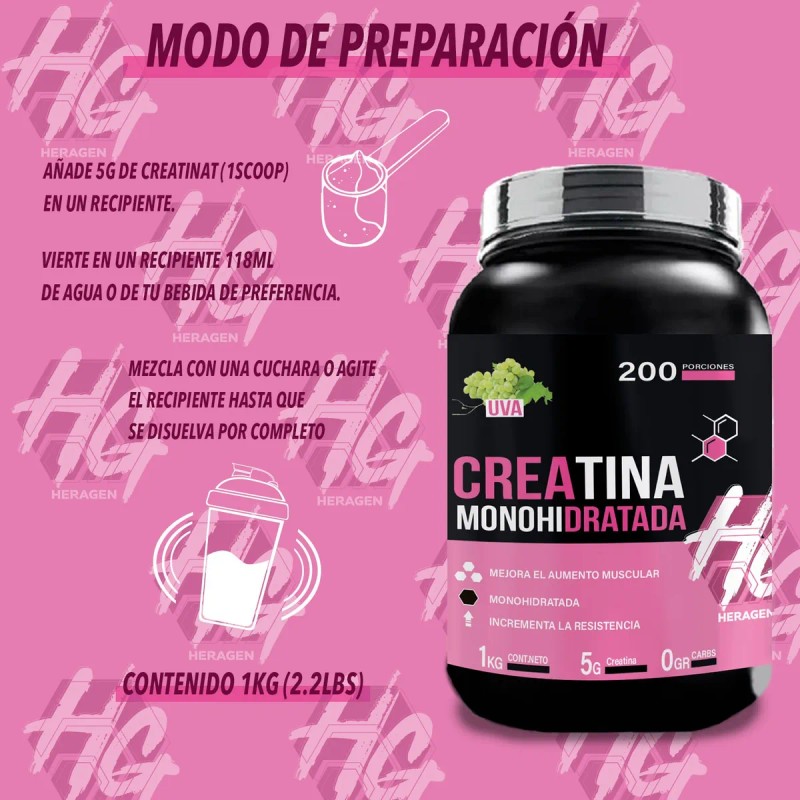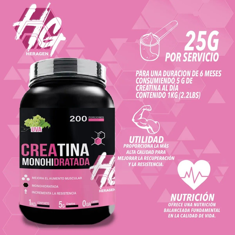 Creatina Suplemento Monohidratada Heragen 1kg 200 Servicios Uva